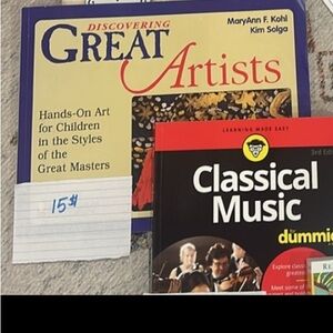All prices listed. Scribblers $85, Drawing w/children 15, my body $5, Janice Van cleaves 201 experiments $15, discovering great artists $15, classical music for dummies $20