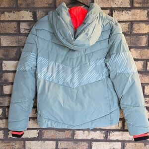 size 6, brand new in plastic with tags. gorgeous green and pop of neon reddish pink. this is an amazingly warm jacket!!! don't miss out.