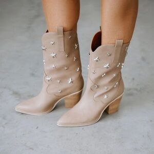 Ccocci Star Studded Western Booties Size 7 Taupe Pull On Pointed Toe Block Heel