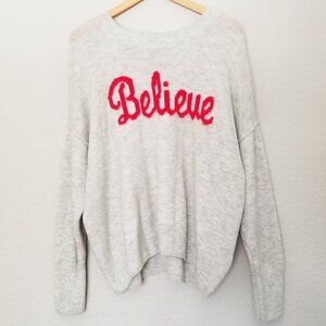CeCe Believe Script Graphic Long-Sleeve Cozy Pullover Sweater M Light Grey $69