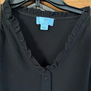 Chic black blouse with button-down front. Features ruffled neckline and long sleeves. Perfect for versatile styling.