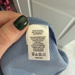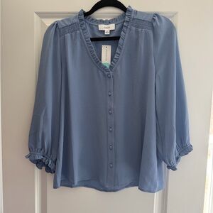 Chic blue blouse with ruffle accents. Features button-up front and three-quarter sleeves. NWT, Stitch Fix boutique brand