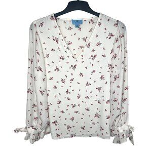 CeCe Breezy Sprigs Ecru Floral Print Long Sleeve V-Neck Tie-Cuff Blouse Large
