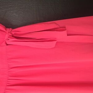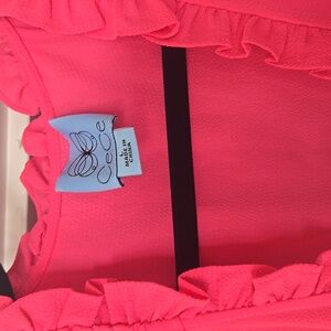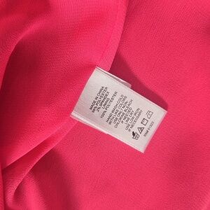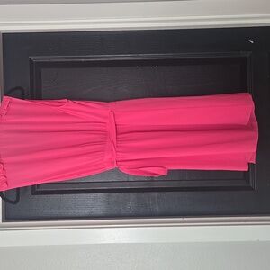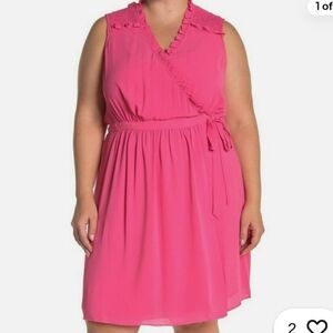 CeCe ruffled hot pink sleevless wrap dress. Size large. Fabric is a polyester chiffon with a lining attached in the skirt. Fabric has  a little stretch. Excellent pre-owned condition. No holes, tears, or stains.