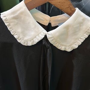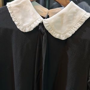 Brand NEW Classy Black/White Blouse by CeCe. Size XS. 1 silver button closure at back of neck area. Peter Pan collar. Long skinny tie on the front. Pearls not included.