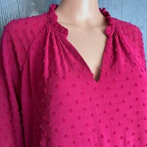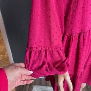 This CeCe clip dot mini dress is 100% polyester. Machine wash and cold and line dry. Split V-neck, tiered fit and flare style, fully lined, puff sleeves. Pullover closure. Baby doll style. Reddish burgundy color. Retails for $99. Current style is still selling in stores. Bohemian, Boho, cottage core, coquette, romantic, retro, trendy.