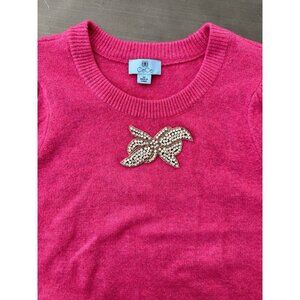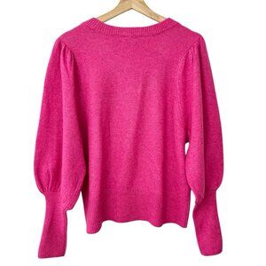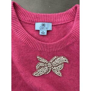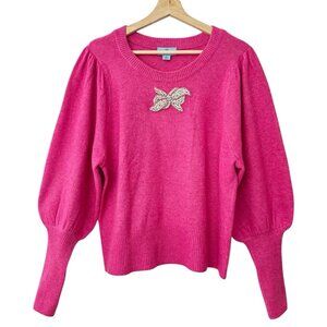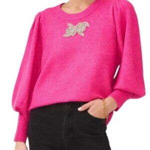 CeCe Cozy Balloon Sleeve Sweater Crystal Appliqué Pink Crew Neck Preppy Spring