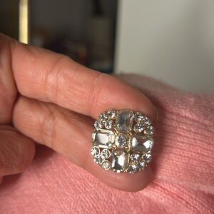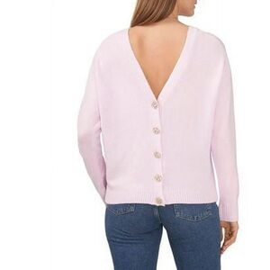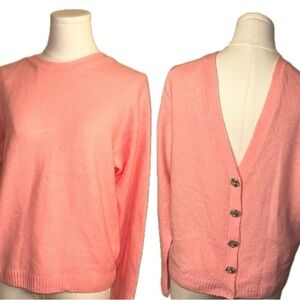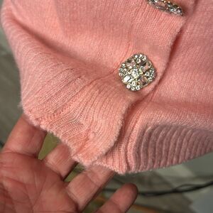 CeCe Vintage 50’s Inspired Jeweled Crystal Embellished Two-Way Oversized Fit Pink Snuggly Soft Knit Cardigan Sweater Sz XS. ( a size small could easily wear this as well ) Can be worn with the buttons deep V side in the front or the back ! Peachy pink beautiful color . Purchased at Macy’s for $79 . Excellent condition no snags , holes or pilling . One of the jeweled “buttons” is missing ( it’s the bottom one ) . The snap closure is still there. You could easily get creative by replacing it with something fun or tuck that bottom of your sweater into the waist of your pants or skirt . Anyway sweater is too pretty not to list it and other than the missing button it’s just excellent. I would reinforce the other buttons :)
