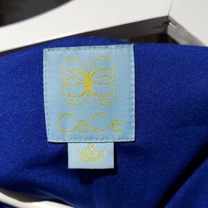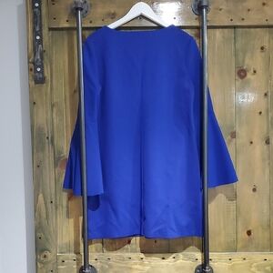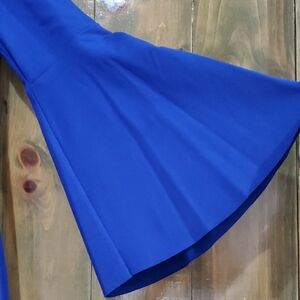 This elegant blue women's dress features a stylish V-neck and flared sleeves, perfect for any occasion. stretch, no flaws
