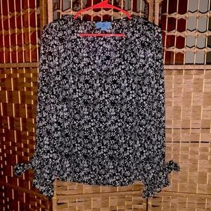 Chic and stylish floral top in black and white. Perfect for any occasion.Model pictured is wearing an example of a long sleeved white and black top similar in some ways to actual top being sold. Actual top being sold is a CeCe Floral Black and White Women's Top shown in subsequent photos.