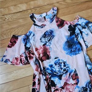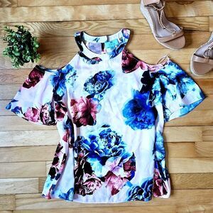CeCe Floral Cold Shoulder Top - Blue and Pink