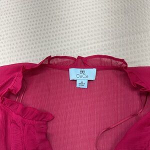 Chic fuchsia blouse with ruffle accents. Button-down front. Ideal for stylish outings.