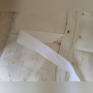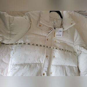 NWT never worn never washed measurements are totally approximate since I can not get tape measure to lay flat. 2 pockets, no flaws that I can observe. color is ivory,I laid a white ribbon across to show white against ivory. I did pay tag price because I just had to have it ,then decided I need to purge jackets since I own so many and have a simular one.