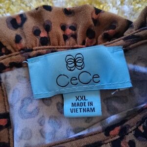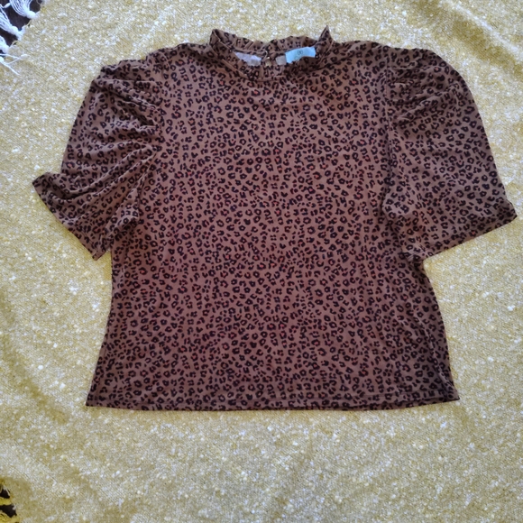 Stylish leopard print blouse with ruffle neck. Perfect for a bold look.