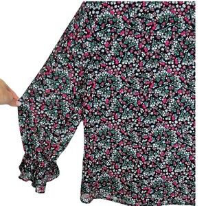 CeCe Long Sleeved Ditsy Floral Peter PanCollar Blouse. Size Small. Ruffled collar with tie. Ruffled sleeves with elastic. 100% polyester.