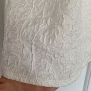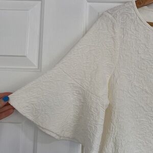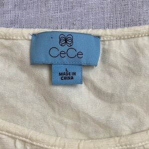 This CeCe blouse is a romantic and lovely piece. It’s a soft cream color with a textured pattern and quarter-length bell sleeves. Although the tag is missing, the tie is still attached. It’s a size large.