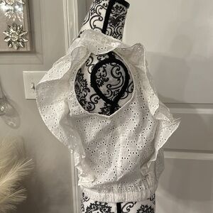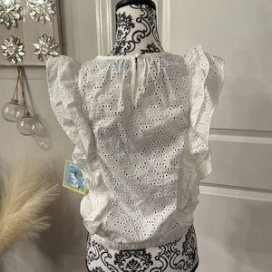 Super Cute Top by CeCe New with tag. Size Small Has ruffled detail on sleeves and down front. Comfy elastic bottom. Bright White. Adorable with jeans. From Smoke and Pet Free Home. Has one button at top in back. Extra buttons included