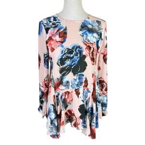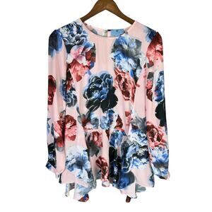 CeCe Pink Peony Floral Print Long Sleeve Peplum Chiffon Tunic Blouse
