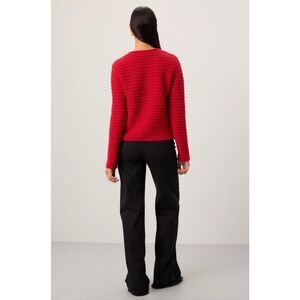 Red knit (80% Cotton, 20% Polyester). Crew neck. Long sleeves. Front button closure. 22" from shoulder to hemline.pit to pit 22