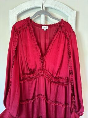 Mulberry red maxi dress with tiered ruffle details. V-neck with feminine trim. Flowing long sleeves for soft movement.