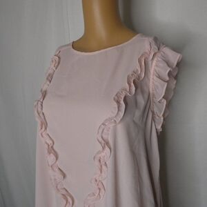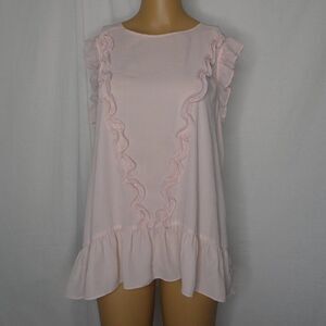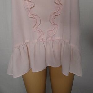 Gorgeous pale pink top with keyhole and button detail at back of neck, cascading ruffles down the front, and ruffle short flutter sleeves with skirted ruffle hem. In excellent conidtion.
