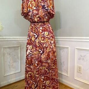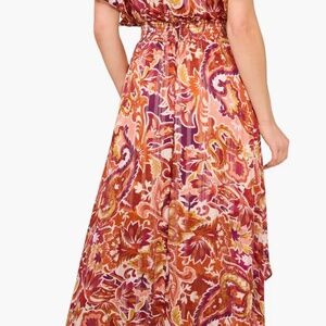 CeCe Size M Fluttersleeve Dress. Size Medium. Purchased for an event, wore one time and had dry cleaned (even though directions state machine washable). **See photo for details on dress. Beautiful, flowy and fun. For reference I am 5’5” true size M and this dress fits perfectly. Partially lined top and thigh level. Color considered wine, but has orange, rust and white in it. All my items were purchased new by me for personal use.