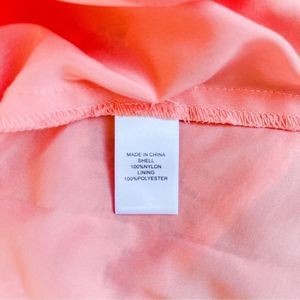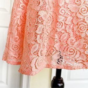 Floral and lacy peach/orange blossom A-Line dress that is flattering to the figure. Pairs nicely with a set of heels (semi-formal) or sandals (for a beach look) depending on how you want to dress it.