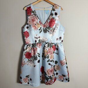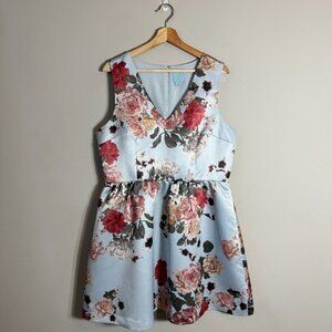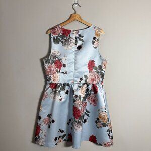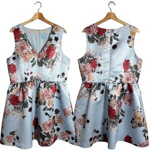 CeCe Sleeveless V-Neck Floral Fit & Flare Mini Dress Women's 14 Blue Satin Party