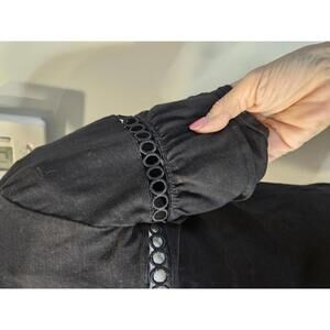 black puff sleeve top, perfect for any occasion. Its unique design features intricate cut-out detailing along the chest and sleeves, providing a touch of elegance. Made from soft and breathable fabric, this top ensures all-day comfort. The relaxed silhouette makes it easy to pair with jeans or skirts, offering versatility for both casual and dressy looks.