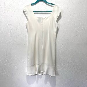 Pre-owned CeCe mini dress with a sleek design and clean lines. This sheath dress features solid moss crepe fabric, vertical seams for a flattering silhouette, cap sleeves, a notched V-neckline, and a concealed back zipper. It has a ruffled hemline and is fully lined for comfort.