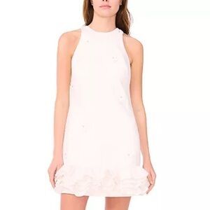 Chic white mini dress with ruffle hem. Sleeveless design. Perfect for any event like a bridal shower, reception or another fun event!! New with tags