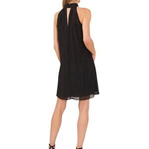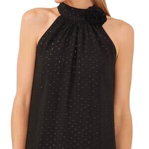 Women’s Sleeveless Rosette Halter Dress from CeCe. Metallic flecked clip dot fabric lends shine to this swingy sleeveless dress, while a rosette at the neckline adds extra romance. Fitted through the chest and arms. Sits away from the body through the waist and hips. Hits above the knees. Mock neck. Shift silhouette. Button closures at back neckline. Sleeveless with cutaway shoulders. Rosette at neckline; metallic clip dot fabric. Lined.
