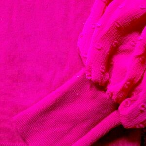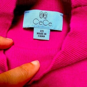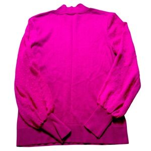 Keywords: CeCe fuchsia sweater, XS mock neck top, sheer puff sleeve blouse, statement sleeve sweater, bold pink top, feminine dressy sweater, dotted mesh sleeves