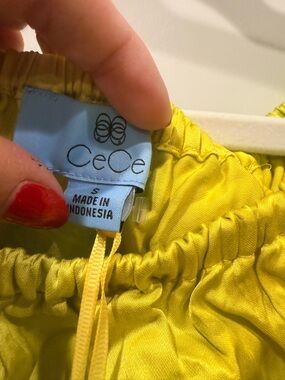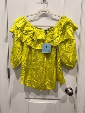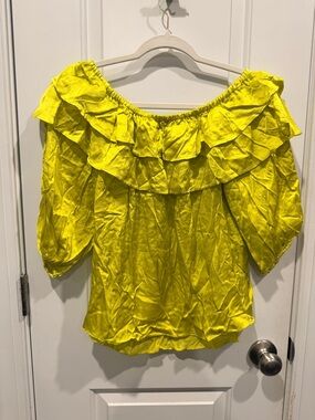 CeCe bright yellow off-shoulder blouse with layered ruffle neckline. Lightweight woven fabric with three-quarter sleeves. Elasticized neckline for easy, comfy wear. Feminine silhouette that pairs with casual or dressy looks. Needs a steam. NWOT.