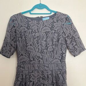 Gently used, CeCe by Cynthia Steefe, a feminine gray lace romper with short sleeves. This chic romper features short sleeves and a back zip closure. Perfect for Spring and Summer events. Gently used.