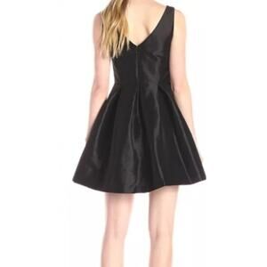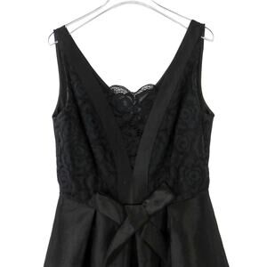 Cece by Cynthia Steffe Black Satin Mini Dress. Fit & Flare Mini Little Black Dress Cocktail Dress with Lace Underlay & Front Ribbon Bow.