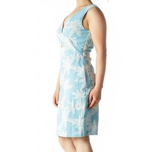Blue White Jacquard Floral-Texture V-Neck Front Cut Out Day Dress