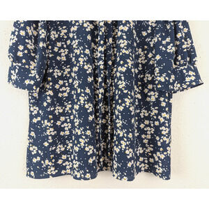 size XL, blouse, textured fabric, v-neck ties at front, about elbow sleeves, blue in color with off white & yellow flowers