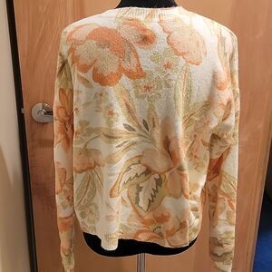 Stylish floral lightweight sweater with vibrant orange and cream design. Perfect for casual outings. sz large. perfect condition. worn once.