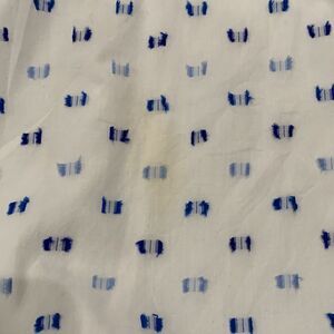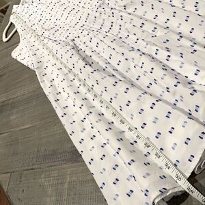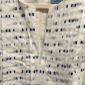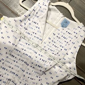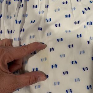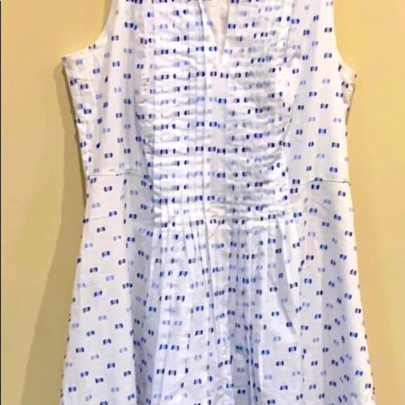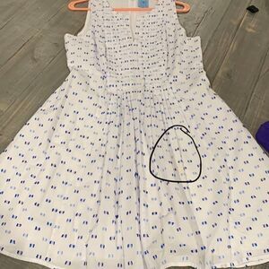 Great summer dress. White with blue accents, lined, size 10. Has one spot that I have been unable to remove. Hard to see unless really looking for it. Spot posted in last pic.