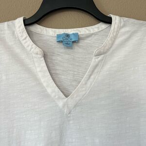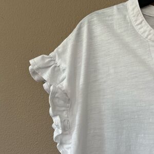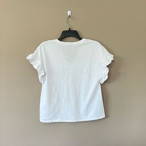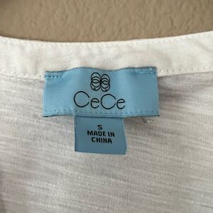 White split neck tee by CeCe! Ruffled sleeves. Boxy, relaxed fit. Size Small. Faint blue stain on the back as shown in the picture, but not noticeable.