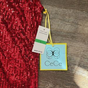 This listing is for a NWT's CeCe Sequined V-Neck Cap-Sleeve Red Blouse, in size large. Upgrade your look with this V-neck top from CeCe. This beautiful top has sequins throughout for an all-over shine.