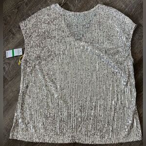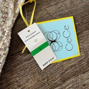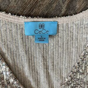 This listing is for a NWT's CeCe Sequined V-Neck Cap-Sleeve Silver Blouse, in size Large. Upgrade your look with this V-neck top from CeCe. This beautiful top has sequins throughout for an all-over shine.