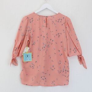 A dreamy floral print blossoms on a woven blouse complete with tie details at the sleeves. Jewel neck Elbow-length sleeves.