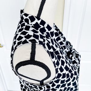 This unique floating rhombus dress in black and white is high contrast and stands out. Pair with a black belt and some heels. Dresses up with a suit jacket. Also doubles up as an optional maternity piece for petite sized women.