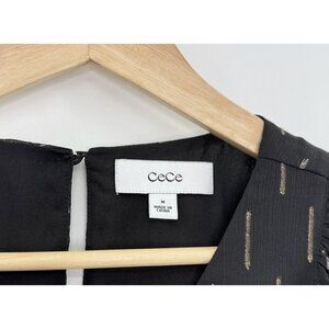 The Cece Black Chiffon Flutter Sleeve Blouse is a stylish and versatile piece perfect for various occasions including formal events, workwear, and casual outings. Made from polyester chiffon with a metallic striped print, this blouse features a classic round neckline and button closure. The flutter sleeves add a touch of elegance, while the black and gold color scheme gives it a chic and sophisticated look. Ideal for all seasons, this lined blouse by Cece is a wardrobe staple for women looking for a blend of office preppy style. Good used condition. No stains or holes found. Please feel free to ask any questions.