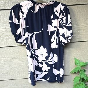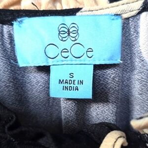 Cece Black Tan Floral Short Puff Sleeve Tie Front Blouse Small