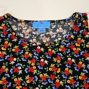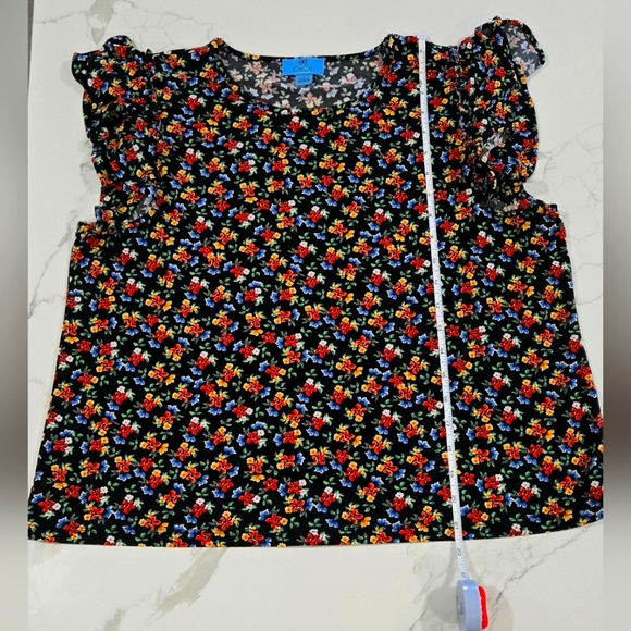 Chic black top with vibrant floral print and ruffle sleeves. Perfect for any occasion. Gently used. No holes, no stains, and intact seams.