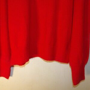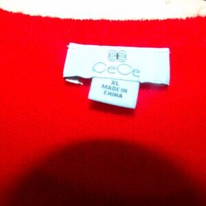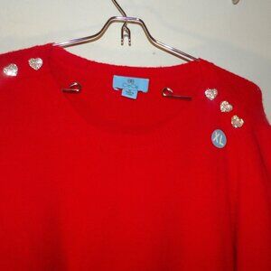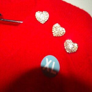 solid red color way , three heart detail on each shoulder in silver and diamond like Tones , long sleeve , crew neck , material is 73% Acrylic 24% Polyester 3% Spandex , Sz XL measurements are roughly 26" from shoulder to hem and about 24" pit to pit , good used condition no issues . pet friendly non smoking home
