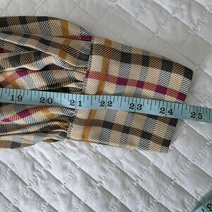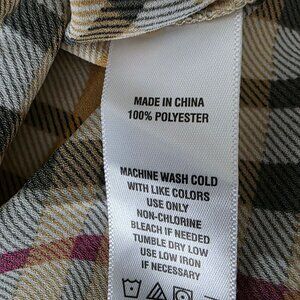 Lightweight plaid blouse with a button-front and bow tie collar. Suitable for casual or semi-formal occasions. Easy-care polyester material.